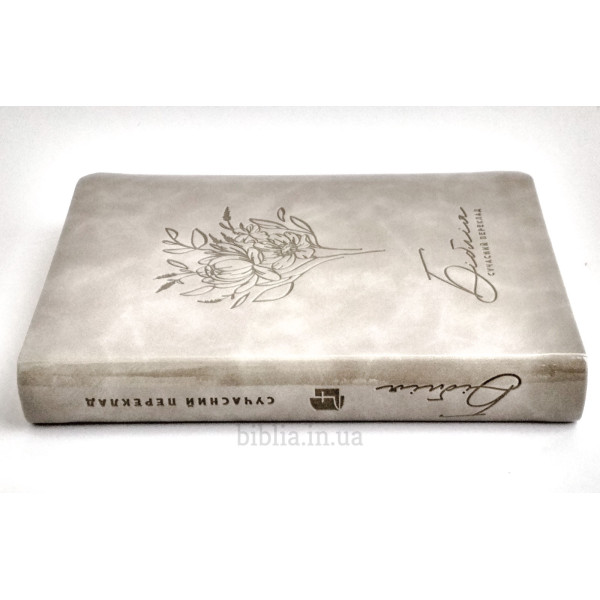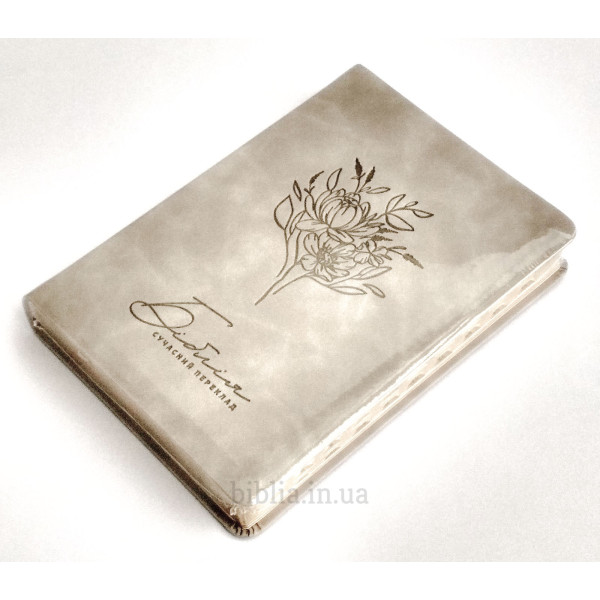 М'яка палітурка із шкірозамінника теплого відтінку світло-сірого кольору з тисненням. При штучному освітленні колір стає бежевим. Закладка лясе. Золотий обріз сторінок. Індекси для пошуку біблійних книг (мітки).