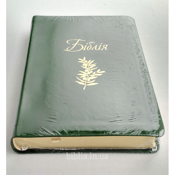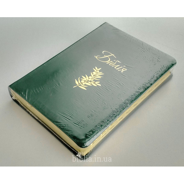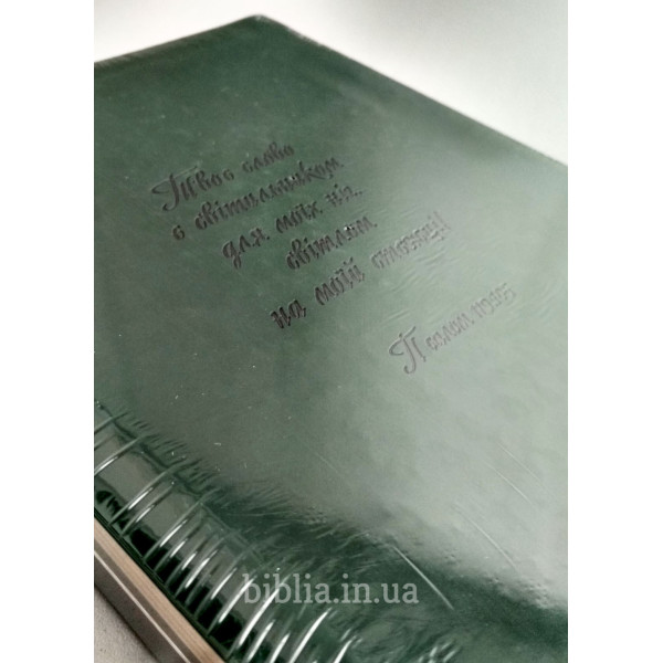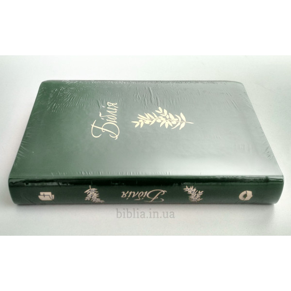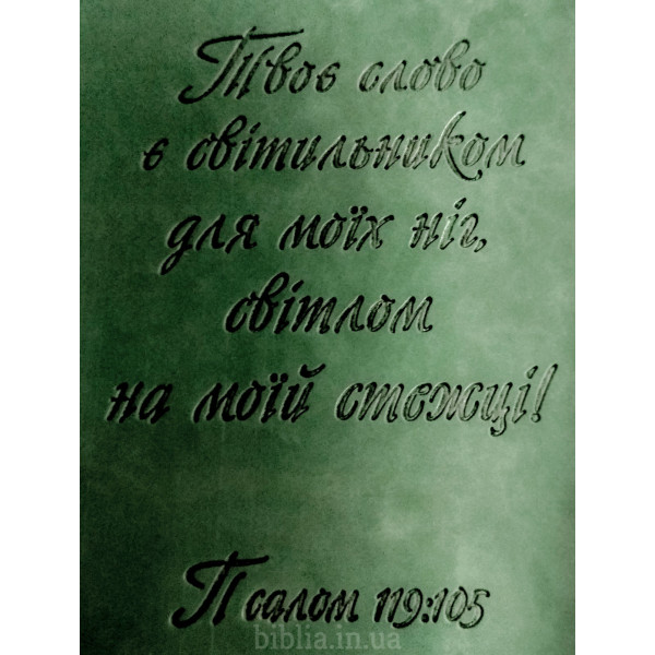 Закладка лясе. Золотий обріз сторінок. Індекси для пошуку біблійних книг (мітки). М'яка палітурка із шкірозамінника темно-зеленого кольору. На звороті напис: "Твоє слово є світильником для моїх ніг, світлом на моїй стежці!" Псалом 119:105.
