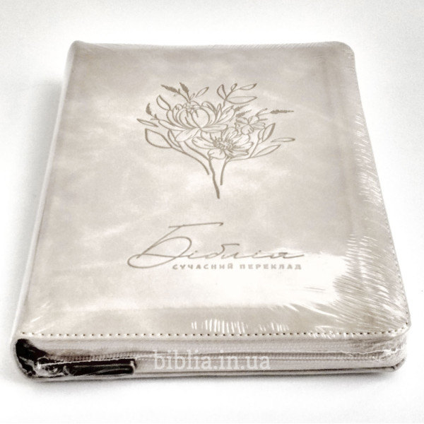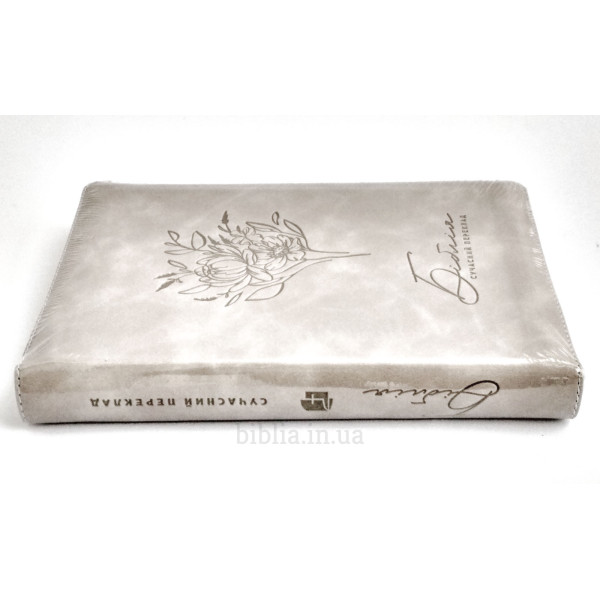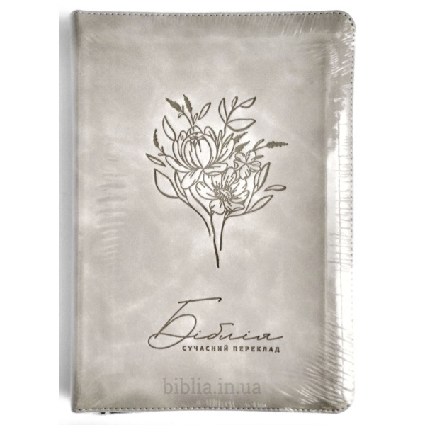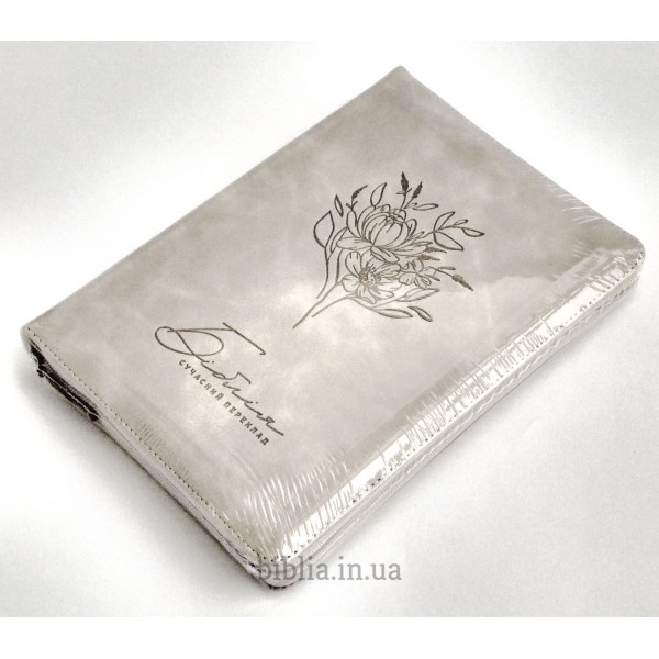 М'яка палітурка зі шкірозамінника теплого відтінку світло-сірого кольору з тисненням. При штучному освітленні колір стає бежевим.
