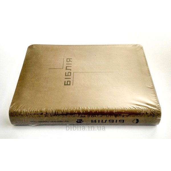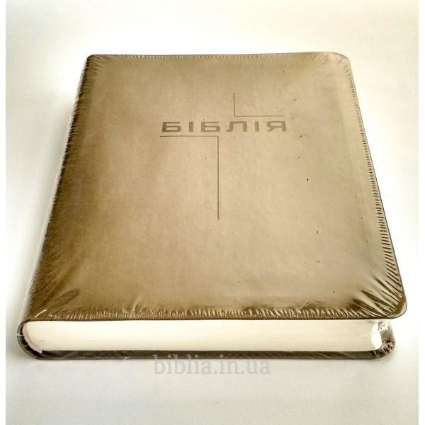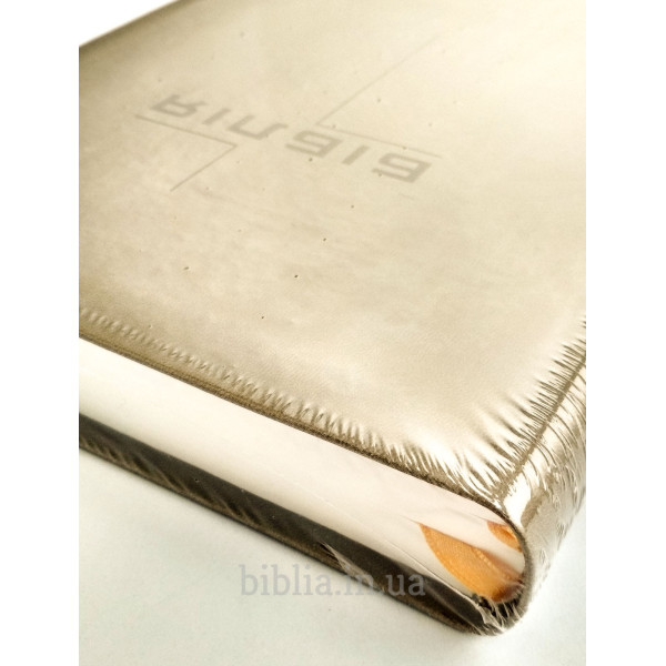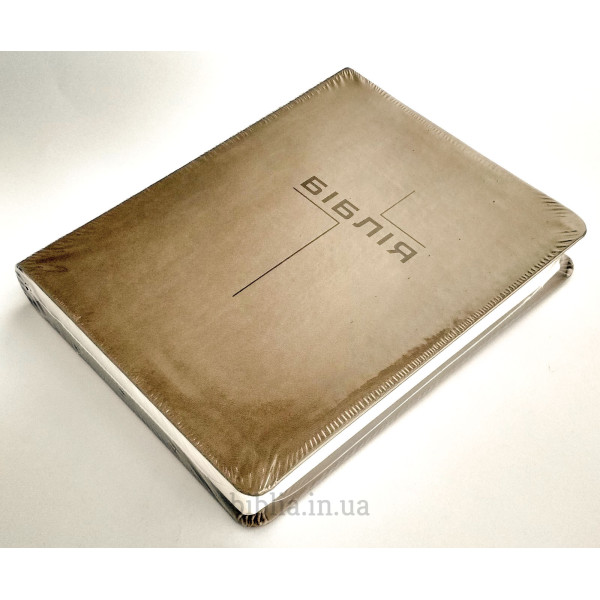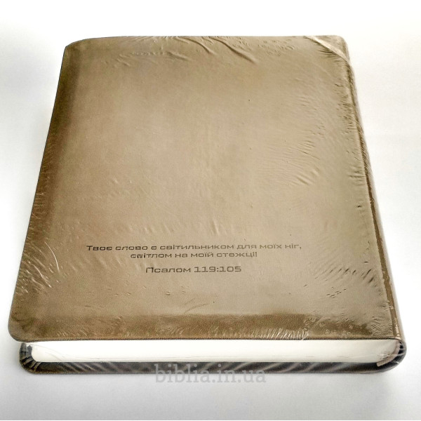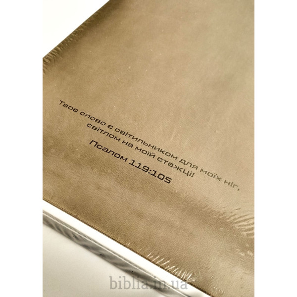 М'яка палітурка із шкірозамінника сіро-коричневого кольору. На звороті напис: "Твоє слово є світильником для моїх ніг, світлом на моїй стежці!" Псалом 119:105.