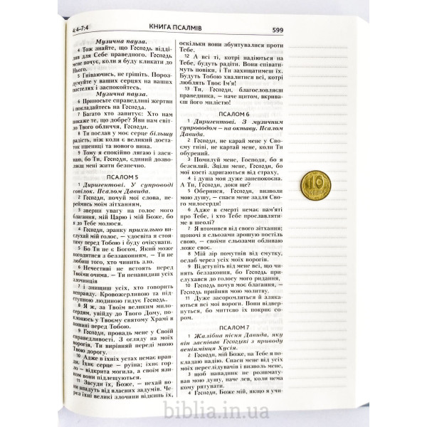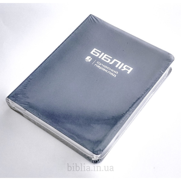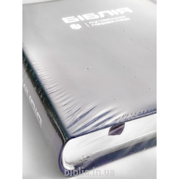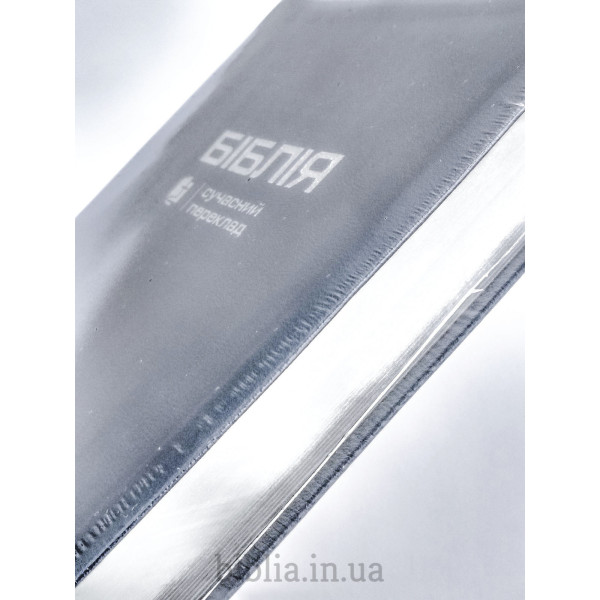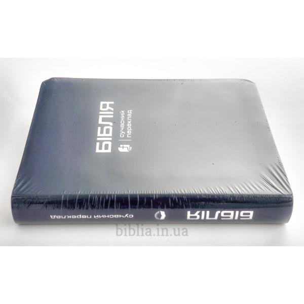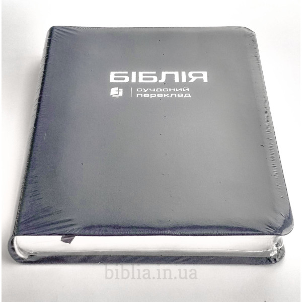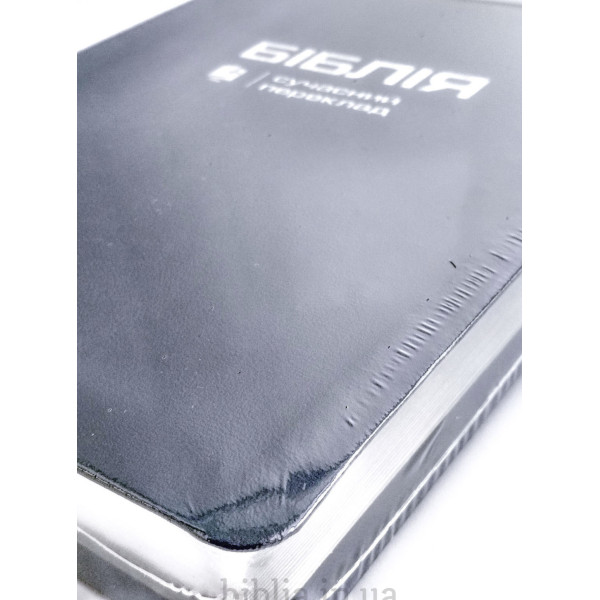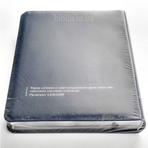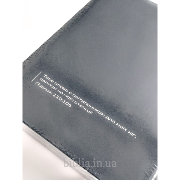 М'яка палітурка із шкірозамінника чорного кольору. На звороті напис: "Твоє слово є світильником для моїх ніг, світлом на моїй стежці!" Псалом 119:105.