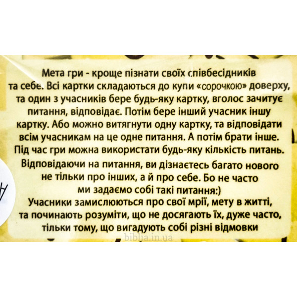 Мета гри: краще пізнати своїх співбесідників та себе. Відповідаючи на запитання, ви дізнаєтесь багато нового не твльки про інших, а й про себе. Бо не часто ми задаємо собі такі питання...