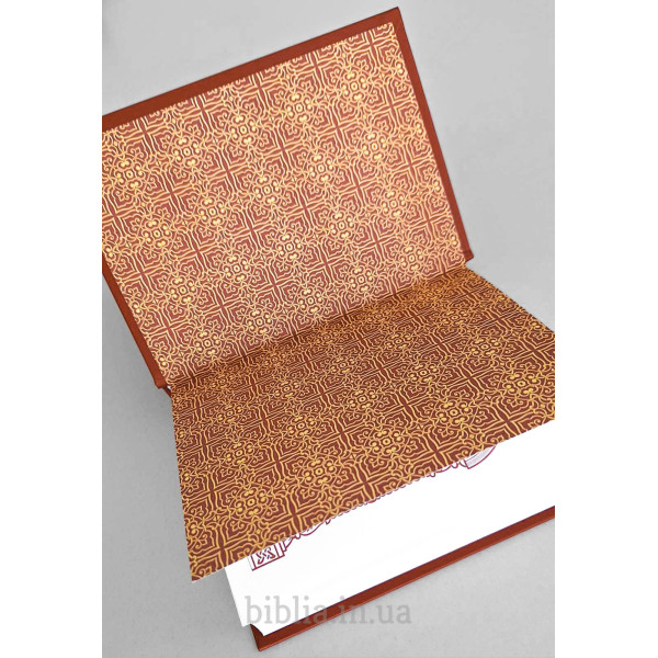Белая офсетная бумага, двухцветная печать. Шрифт жирный. 832 страницы. Две закладки ляссе. Твердый переплет красного цвета с золотистым орнаментом.