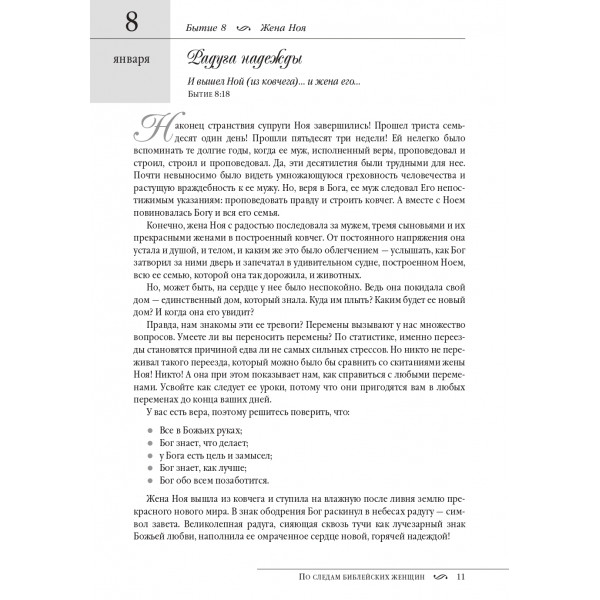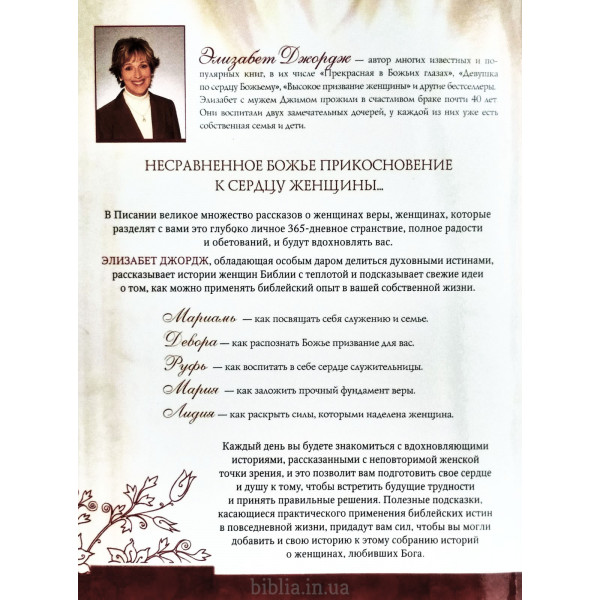 В Писании великое множество рассказов о женщинах веры, женщинах, которые разделят с вами это глубоко личное 365-дневное странствие, полное радости и обетований, и будут вдохновлять вас. Каждый день вы будете знакомиться с вдохновляющими историями, рассказанными с неповторимой женской точки зрения, и это позволит вам подготовить своё сердце и душу к тому, чтобы встретить будущие трудности и принять правильные решения. Полезные подсказки, касающиеся практического применения библейских истин в повседневной жизни, придадут вам сил, чтобы вы могли добавить и свою историю к этому собранию историй о женщинах, любивших Бога.