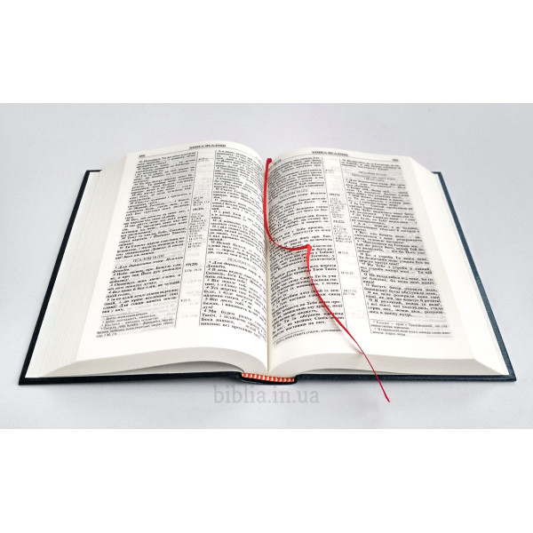 Текст розташований у дві колонки, паралельні місця посередині сторінки. Жирний шрифт. Виділено підзаголовки. Папір офсетний білий. В кінці - 8 чистих аркушів для записів. 1240 сторінок.
