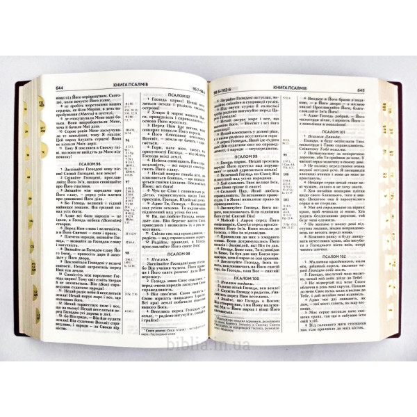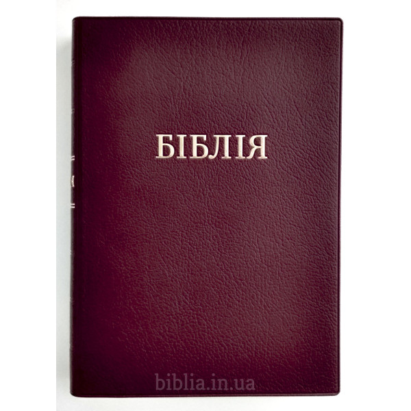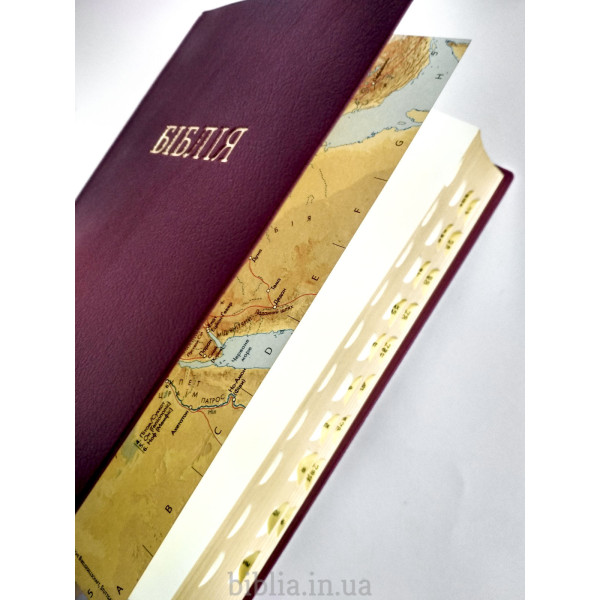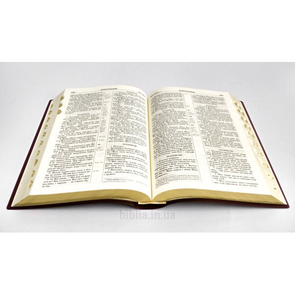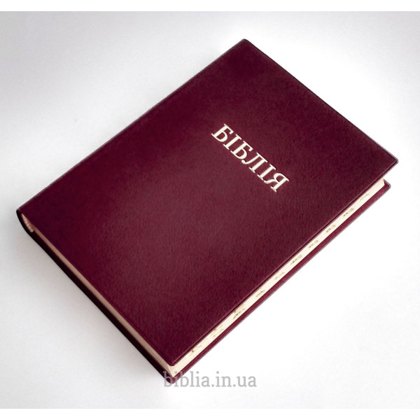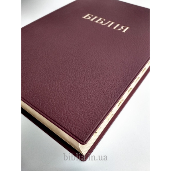 М'яка вінілова палітурка бордового кольору. Золотий обріз сторінок. Індекси для пошуку біблійних книг.
