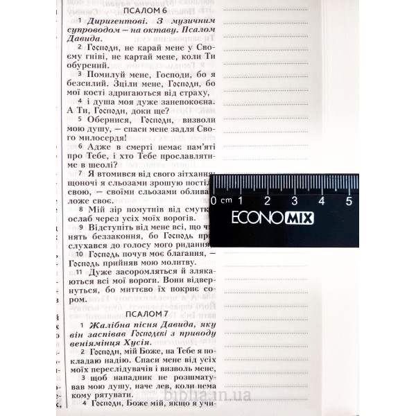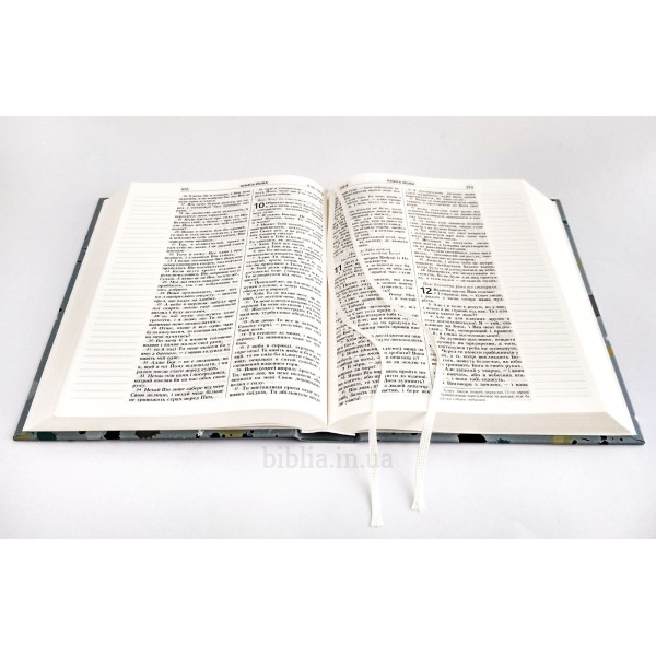Текст розташований в дві колонки. Без посилань на паралельні місця. Шрифт середнього розміру, жирний. Сторінки з полями для нотаток (маргінесами). Папір білий з молочним відтінком, офсетний. Без карт. В кінці Біблії - чисті сторінки для нотаток. Дві закладки-лясе.