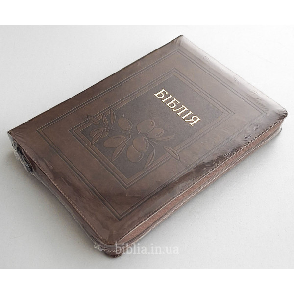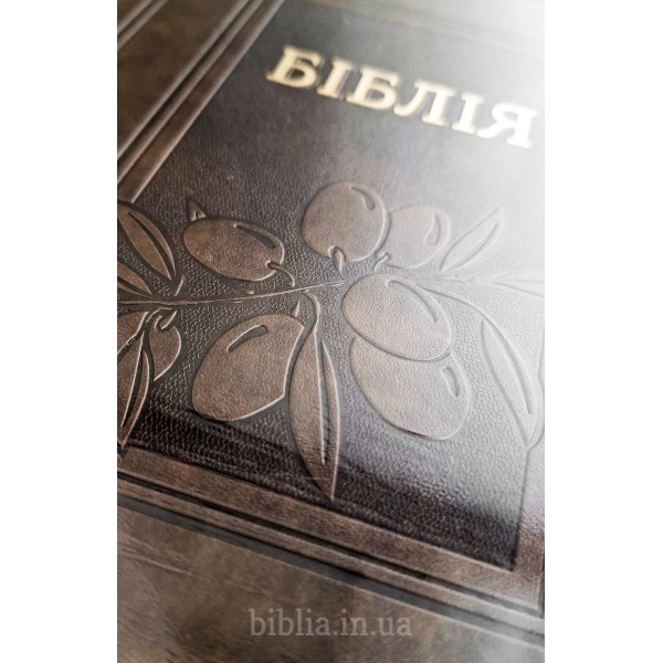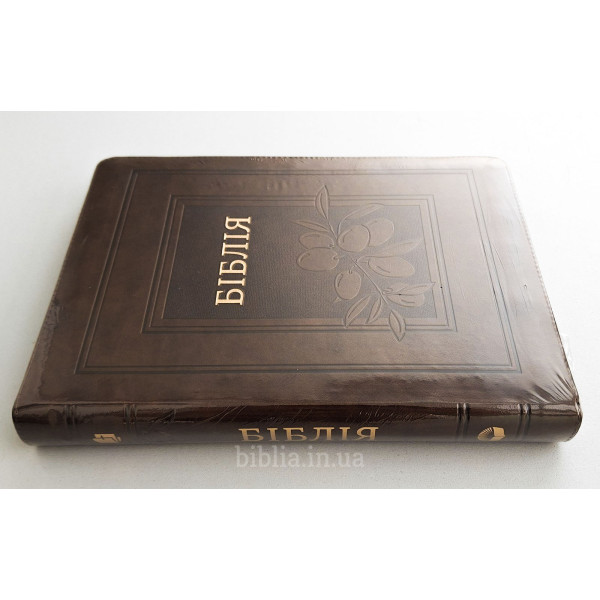 М'яка палітурка зі шкірозамінника коричневого кольору з тисненою гілкою оливи.