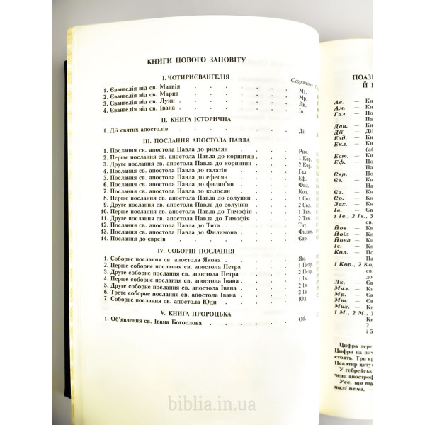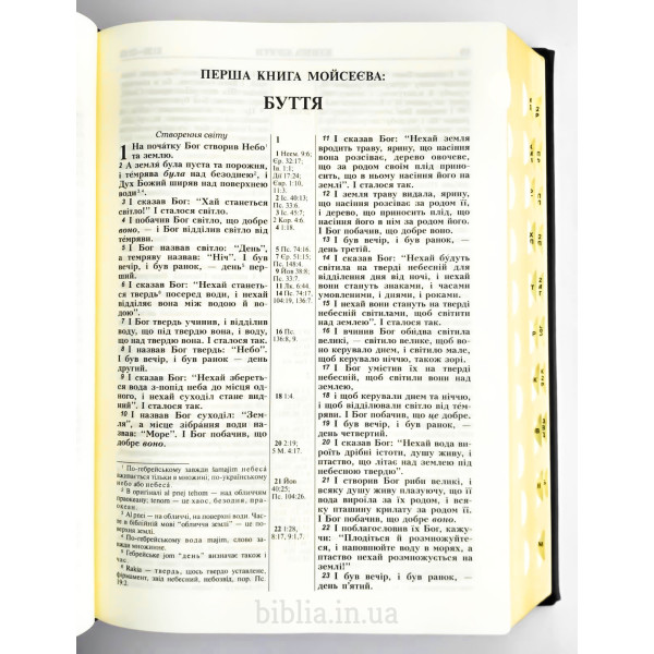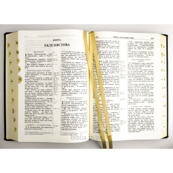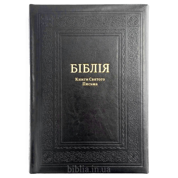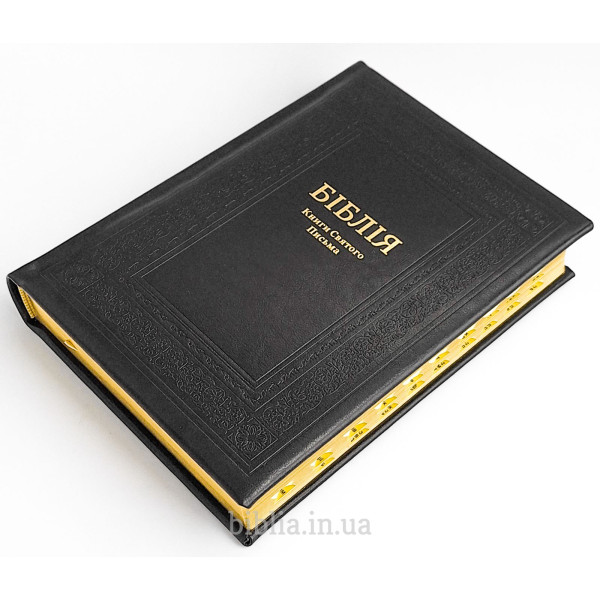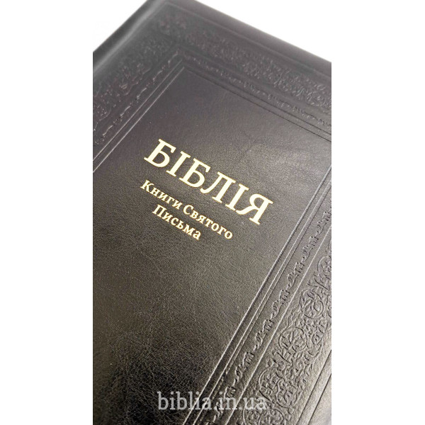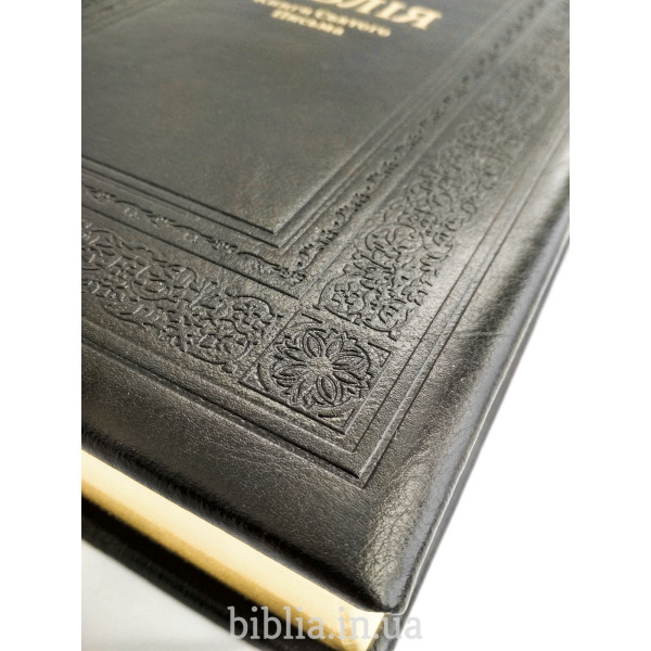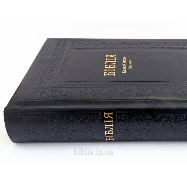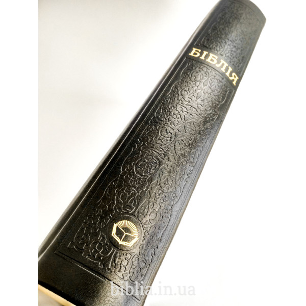Тверда шкіряна палітурка чорного кольору з тисненням. Золотий обріз сторінок. Індекси для пошуку біблійних книг. Закладка лясе. Коробка з кольорового картону.
