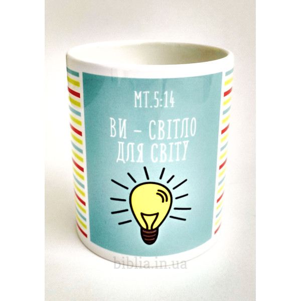 Чашка керамічна: Ви - світло для світу. Матвія 5:14.Українська мова.Вага: 0,350 кг.Об'єм: 310 мл...