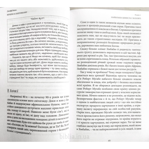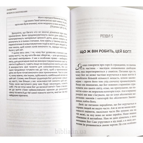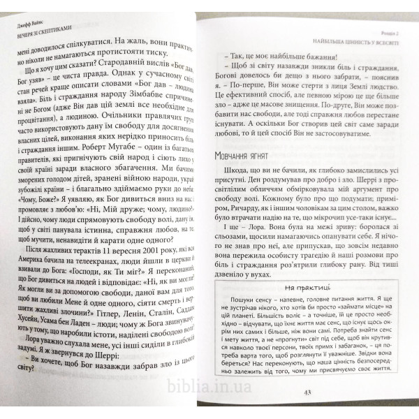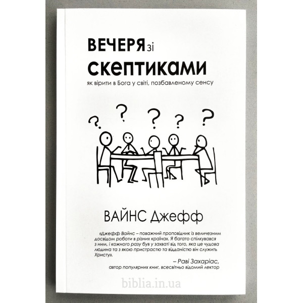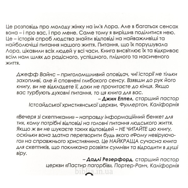 Книга Джеффа Вайнса "Вечеря зі скептиками" - про жінку, яка вважала, що існування нашого світу таким, який він є, суперечить ідеї існування Бога. Він залишив нас, Його немає. Щасливого фіналу не буде. Але Лора знову відкрила для себе Бога. У її історії стільки ж таємниць і несподіванок, як в пригодницькому романі...